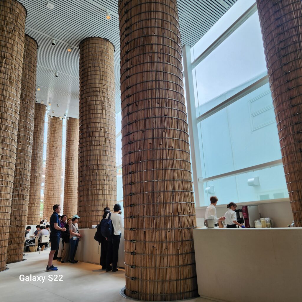 太い柱が立ち並ぶ展示空間と低い仕切りでセパレートされた